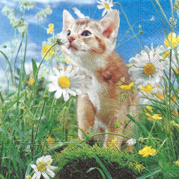 2 serviettes en papier découpage collage 33 cm CHAT PRE FLEUR